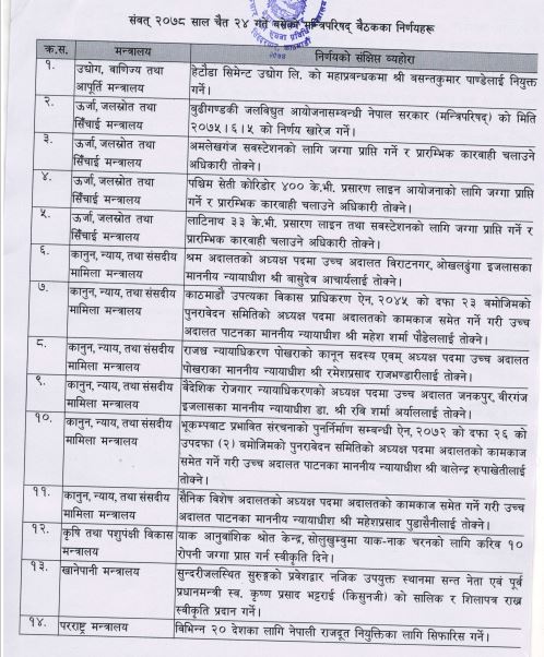 सूचना तथा संचार प्रविधिमन्त्री ज्ञानेन्द्रबहादुर कार्कीले शुक्रबार नियमित पत्रकार सम्मेलनमा बैठकले समस्याग्रस्त सहकारी संस्था वा संघको व्यवस्थापन समितिको अध्यक्षमा प्रशासकीय अदालतका पूर्वअध्यक्ष काशीराज दाहालालाई र सदस्यमा केशवराज आचार्यलाई नियुक्ति तथा मनोनयन गर्ने निर्णय गरेको बताए ।
