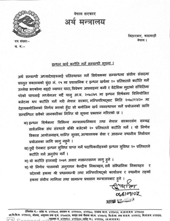 आज अर्थ मन्त्रालयबाट जारी सूचनामा इन्धन शीर्षकमा विभिन्न मन्त्रालय, निकाय तथा सरकारसँग सम्बद्ध सार्वजनिक संघसंस्थाले बाँकी बजेटको २० प्रतिशत खर्च कटौती गर्नुपर्ने उल्लेख छ।