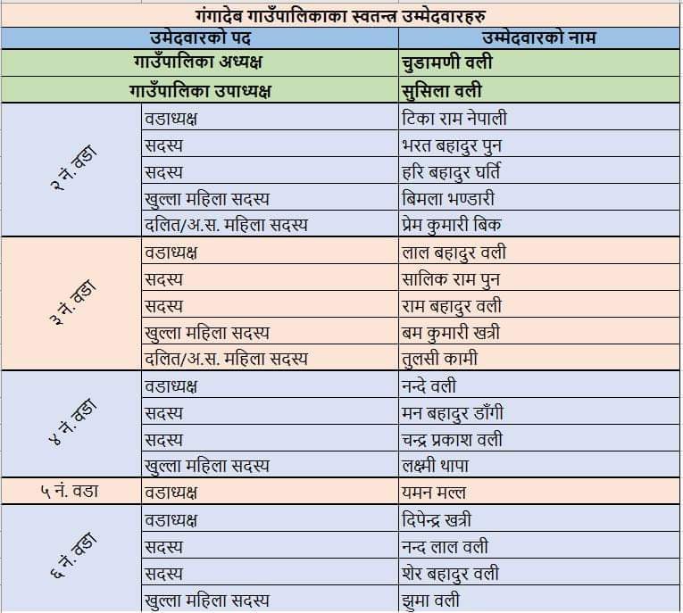 रोल्पाकै कतिपय ठाँउमा गठबन्धन गरेपनि गंगादेव गाउँपालिकामा भने नेकपा एक्लै चुनावमा होमिएको पत्रकार केबी गुरुङले जानकारी दिए । नेकपाले उपाध्यक्षमा सुशीला वलीलाई उमेद्वारी बनाएको छ ।