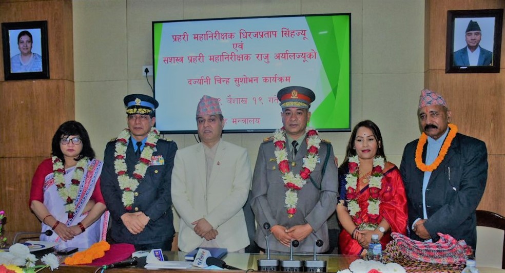 काठमाडौं । नेपाल प्रहरीका नवनियुक्त महानिरीक्षक धिरजप्रताप सिंह र सशस्त्र प्रहरी बलका आईजीपी राजु अर्यालले दर्ज्यानी चिन्ह लगाएका छन् ।