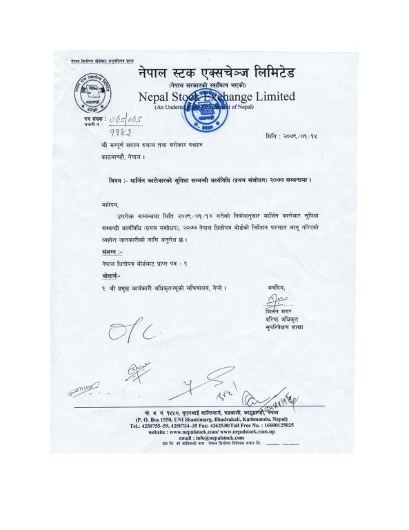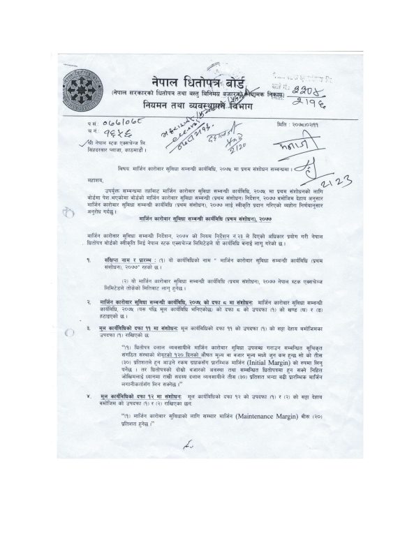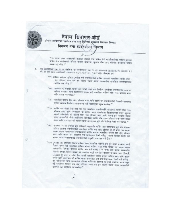 नेपाल स्टक एक्सचेन्ज (नेप्से)ले मार्जिन कारोबार सुविधा सम्बन्धी कार्यविधि (प्रथम संसोधन) २०७७ लागु गरेसँगै सेयर ब्रोकरहरुले तोकिएको मार्जिन सीमा कायम गर्नुपर्ने अवस्थामा सेयर बिक्री गर्न सक्ने व्यवस्था गरेको छ ।