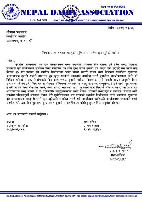“दुध अत्यावश्यक वस्तु भएको र यो वालकदेखि वृद्धवृद्धासम्मका लागि दैनिक अनिवार्य नभईनहुने र यसलाई आजको आजै उपभोग गरिसक्नुपर्ने भएकोले नेपाल डेरी एसोसिएसनले यस पटकको स्थानीय निर्वाचनका लागि प्रकाशित सुचनामा दुध अत्यावश्यक वस्तु हो भन्ने कुरा छुटेकाले समावेश गराई सबै सम्बन्धित यहाँहरुको कार्यालयमा जानकारी गराई सहयोग गरि उक्त दिन दूध तथा दुग्ध पदार्थ ढुवानीमा सहजीकरण गरिदिनु हुन हार्दिक अनुरोध गरिन्छ,” एसोसिएशनका अध्यक्ष राधाकृष्ण सापकोटा तथा महासचिव प्रल्हाद दाहालद्वारा जारी पत्रमा उल्लेख छ ।