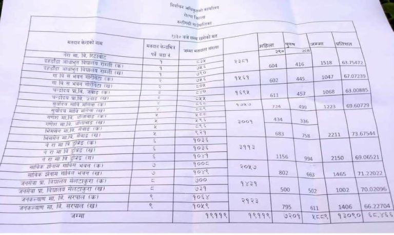 सबैभन्दा बढी वडा नं. ५ मा ७३.६७ प्रतिशत मत खसेकाे छ भने वडा नं. ३ मा सबैभन्दा कम ६३ प्रतिशत मत खसेकाे छ ।