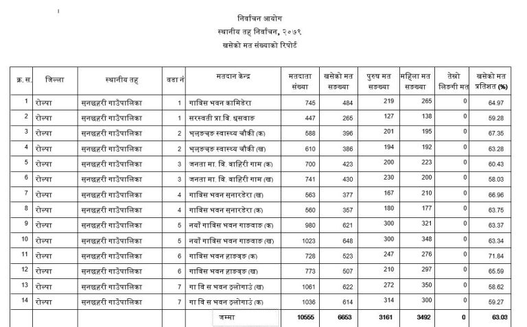 रोल्पा । रोल्पाको सुनछहरी गाउँपालिकामा कुल मतदाता सख्याको ६३.०३ प्रतिशतले मतदान गरेका छन् । रुन्टीगढीमा कुल मतदातासंख्या १० हजार ५५५ रहेकोमा ६ हजार ६४९ ले मतदान गरेका छन् ।