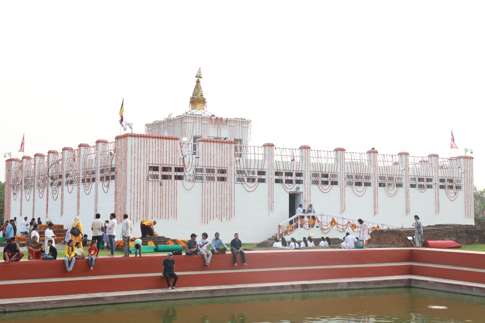 यहाँस्थित अन्तरराष्ट्रिय बौद्ध प्रार्थना केन्द्र तथा प्रेक्षालय नजिक निर्माण गरिएको हेलिप्याडमा प्रधानमन्त्री शेरबहादुर देउवाले भारतीय समकक्षी मोदीलाई हार्दिक स्वागत गरे ।