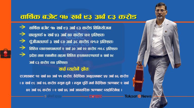 अर्थमन्त्री जनार्दन शर्माले चालूतर्फ ७ खर्ब ५३ अर्ब ४० करोड अर्थात् ४२ प्रतिशत र पुँजीगततर्फ ३ खर्ब ८० अर्ब ३८ करोड अर्थात् २१ दशमलब २ प्रतिशत तथा वित्तिय व्यवस्थापनतर्फ २ खर्ब ३० अर्ब २२ करोड अर्थात् १२.८ प्रतिशतसहितको बजेट पेश गरेका हुन् ।