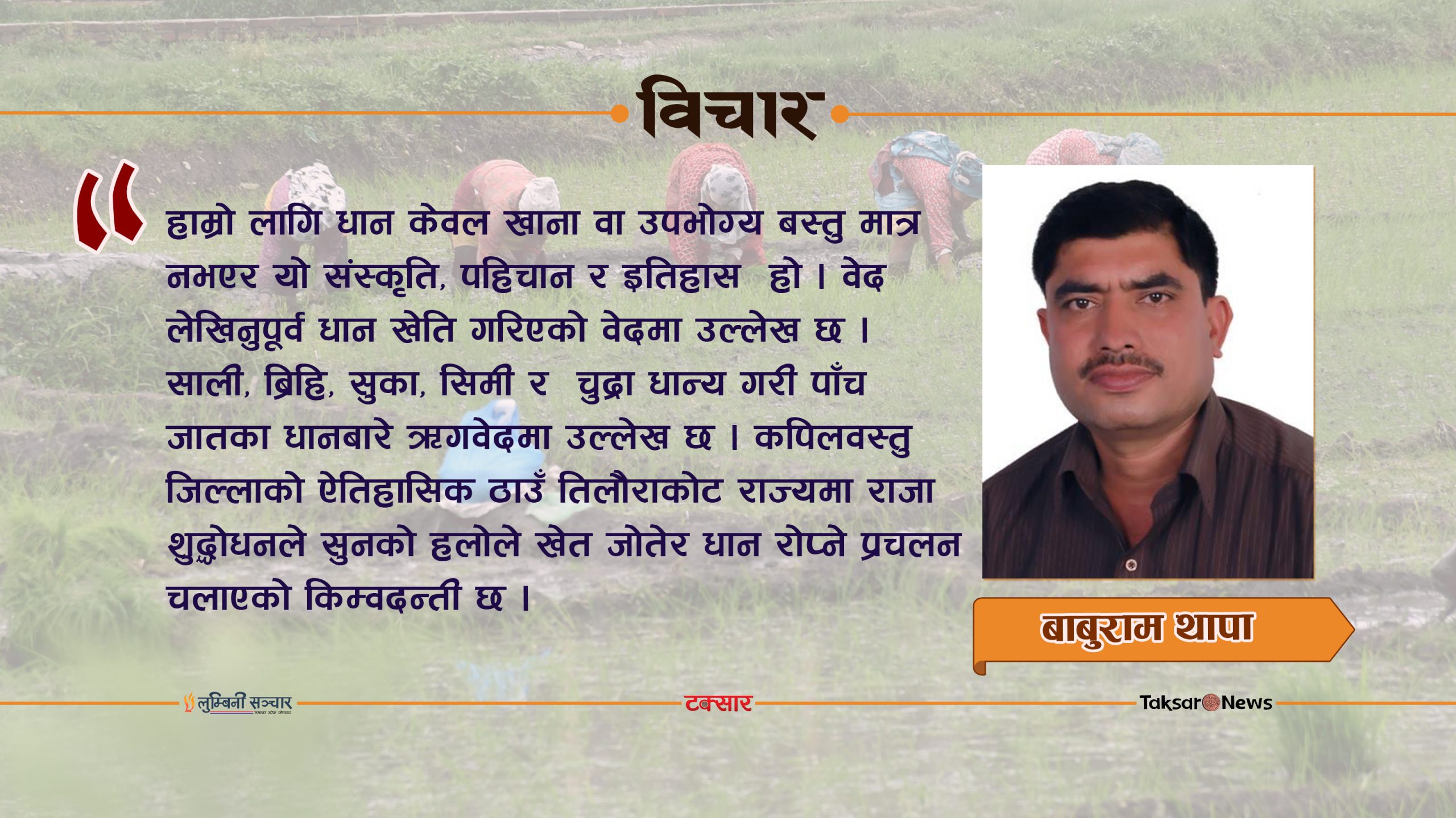 हिन्दु धर्मको विकासक्रमका साथै नेपालको संस्कृति र सभ्यतामा धानको अत्यन्त महत्व छ । हाम्रो लागि धान केवल खाना वा उपभोग्य वस्तु मात्र नभएर यो संस्कृति, पहिचान र इतिहाससँग गाँसिएको विषय हो । वेद लेखिनुपूर्व धान खेती गरिएको वेदमा उल्लेख छ । साली, ब्रिहि, सुका, सिमी र चुद्रा धान्य गरी पाँच जातका धानबारे ऋगवेदमा उल्लेख छ । यसैगरी कपिलवस्तु जिल्लाको ऐतिहासिक ठाउँ तिलौराकोट राज्यमा राजा शुद्धोधनले सुनको हलोले खेत जोतेर धान रोप्ने प्रचलन चलाएको किम्वदन्ती छ । राजा शुद्धोधनले जोतेको खेतमा रोपाई महोत्सव हुँदै आएको छ ।