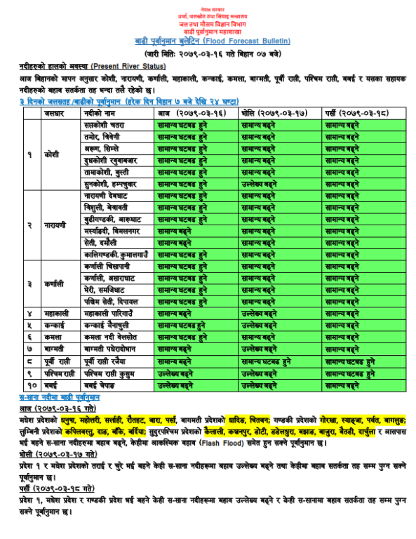 आगामी तीन दिनसम्म प्रमुख नदीहरुमा आकस्मिक वहाव बढ्न सक्ने