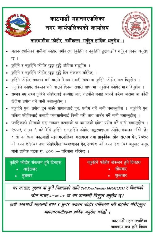 महानगरले २ दिन कुहिने फोहर संकलन गर्ने र २ दिन नकुहिने फोहर संकलन गर्ने जनाएको छ । आजदेखि लागु हुने गरी काठमाडौं महानगरमा कुहिने फोहर आइतबार र बुधबार संकलन गरिने छ भने नकुहिने फोहर सोमबार र शुक्रबार सङ्कलन तथा व्यवस्थापन गरिने भएको छ ।