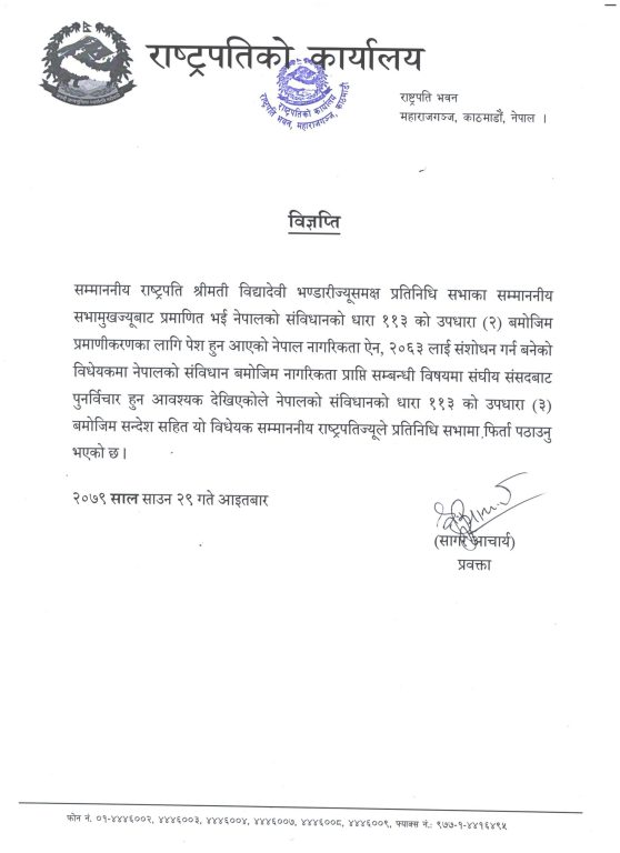 प्रतिनिधि सभाका सभामुख अग्निप्रसाद सापकोटाबाट प्रमाणित भई नेपालको संविधानको धारा ११३ को उपधारा (२) बमोजिम प्रमाणीकरणका लागि पठाइएको नागरिकता विधेयक राष्ट्रपति भण्डारीले फिर्ता पठाएकी हुन् ।
