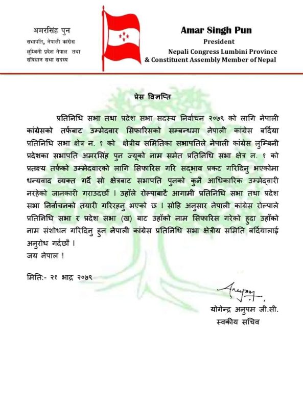 सभापति पुनका स्वकीय सचिव योगेन्द्र अनुपम जि.सी.ले जारी गरेको प्रेस विज्ञप्तिमा भनिएको छ,“ नेपाली कांग्रेस रोल्पाले प्रतिनिधि सभा र प्रदेश सभा (ख) बाट उहाँको नाम सिफारिस गरेको हुँदा नाम संसोधन गरिदिनुहुन नेपाली कांग्रेस प्रतिनिधि सभा क्षेत्रीय समिति बर्दियालाई अनुरोध गर्दछौं ।”