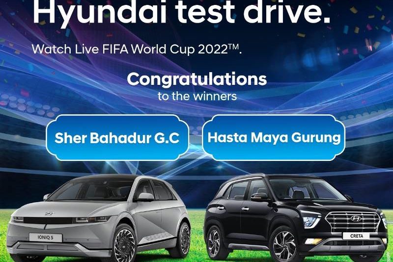 काठमाडौं । हुन्डाई गाडीहरुको नेपालका लागि आधिकारिक विक्रेता लक्ष्मी इन्टरकन्टिनेन्टल प्रालिले विश्व कप २०२२ लक्षित “गोल अफ द सेन्चुरी” अभियान अन्तर्गतको टेष्ट ड्राइभ क्याम्पेन ‘हुन्डाई टेस्ट ड्राइभ वाच लाइभ फिफा वर्ल्ड कप २०२२’ को विजेता घोषणा गरेको छ ।