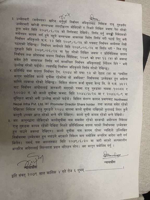 गुरूङले दिएको रिटमा न्यायाधीश ईश्वर खतिवडा र कुमार रेग्मीको इजलासले यसअघिको अल्पकालीन आदेश निरन्तर नहुने उल्लेख गरेको छ । सर्वोच्चले आदेशमा भनेको छ,“ कानुनद्वारा तोकिएको कालोसूचीमा नाम समावेश रहेकोसम्बन्धी अयोग्यता निवेदक राजु गरूङमा कायम रहेको देखिँदा निजले प्रतिनिधि सभा सदस्य पदको निर्वाचनमा उम्मेदवार हुन पाउने अवस्था देखिएन ।”