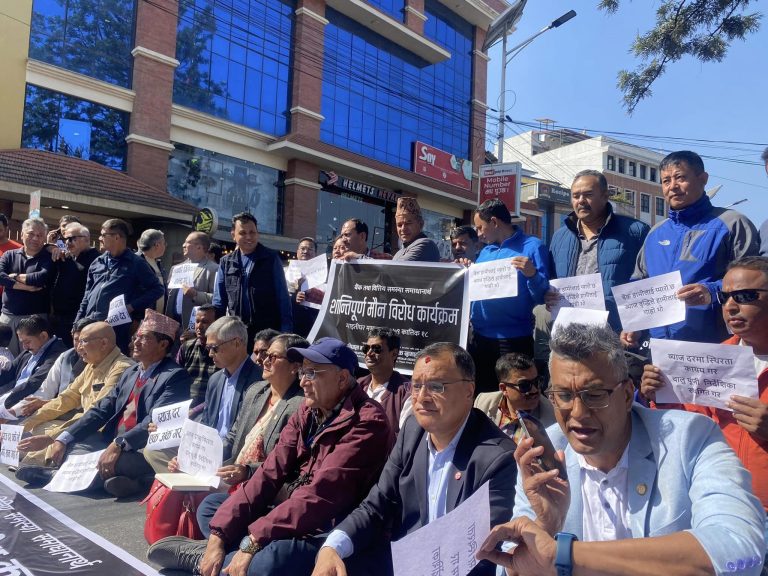 काठमाडौं । बैंक तथा वित्तीय संस्थाको नीतिले मारमा परेको भन्दै उद्योगी व्यवसायी माइतीघर मण्डला क्षेत्रमा मौन प्रदर्शनमा उत्रिएका छन् ।
