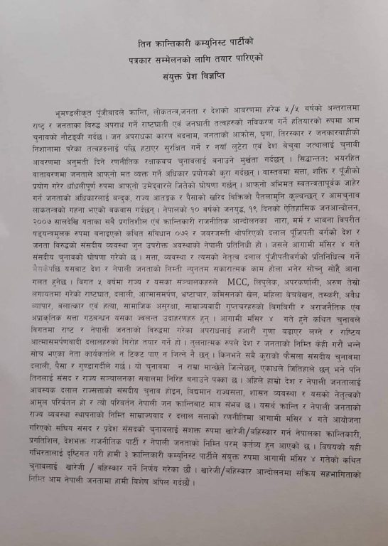काठमाडौं । विप्लव नेतृत्वको नेकपासहित ३ कम्युनिस्ट पार्टीले चुनावी खारेजीको संयुक्त कार्यक्रम घोषणा गरेका छन् ।