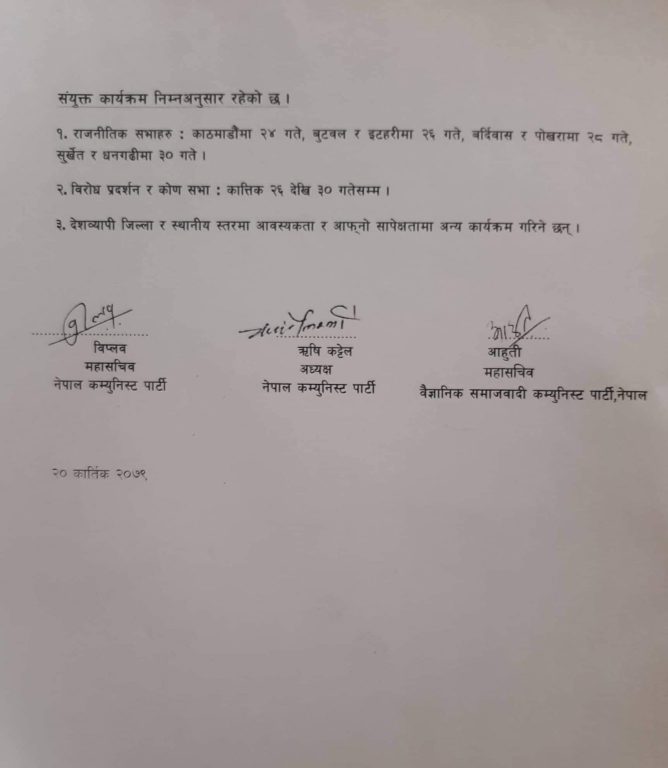 कार्यक्रम अन्तर्गत कात्तिक २४ गते काठमाडौं, बुटवल र इटहरीमा २६ गते, बर्दिवास र पोखरामा २८ गते, सुर्खेत र धनगढीमा ३० गते राजनीतिक सभा हुने छ । त्यस्तै कात्तिक २६ देखि ३० गतेसम्म विरोध प्रर्दशन र कोण सभा गर्ने कार्यक्रममा उल्लेख छ ।