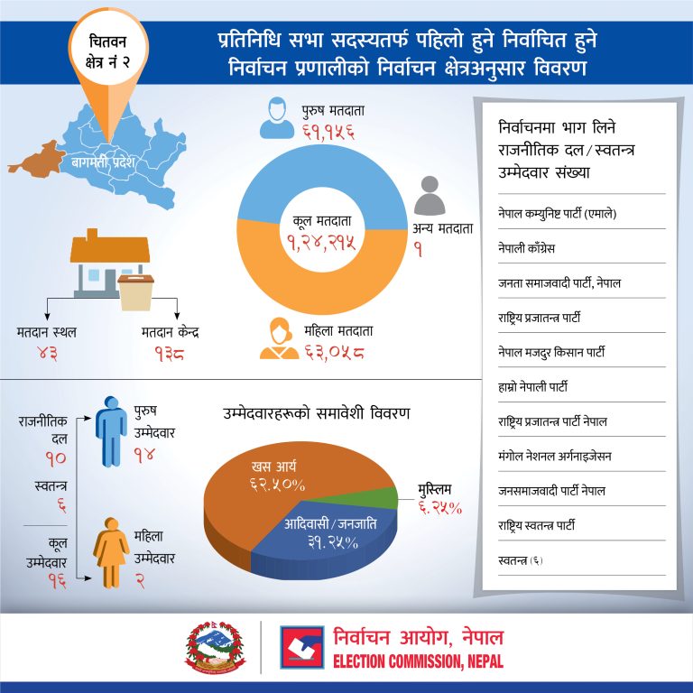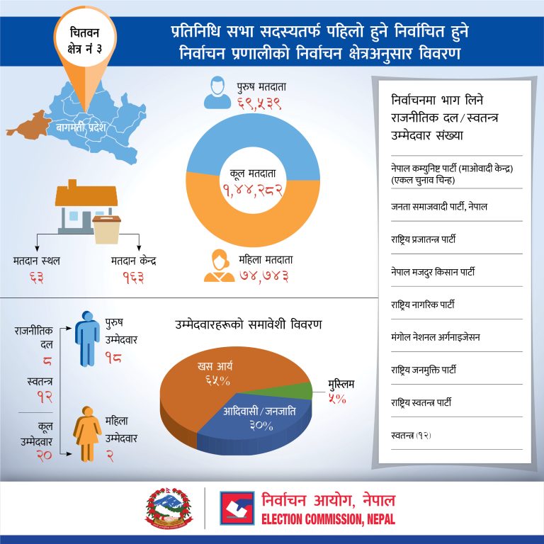 काठमाडौं । निर्वाचन आयोगले प्रतिनिधि सभा तर्फ पहिलो हुने निर्वाचित हुने निर्वाचन प्रणालीको चितवन जिल्लाको निर्वाचन क्षेत्र अनुसार निम्न विवरण रहने निर्वाचन अयोगले जनाएको छ ।
