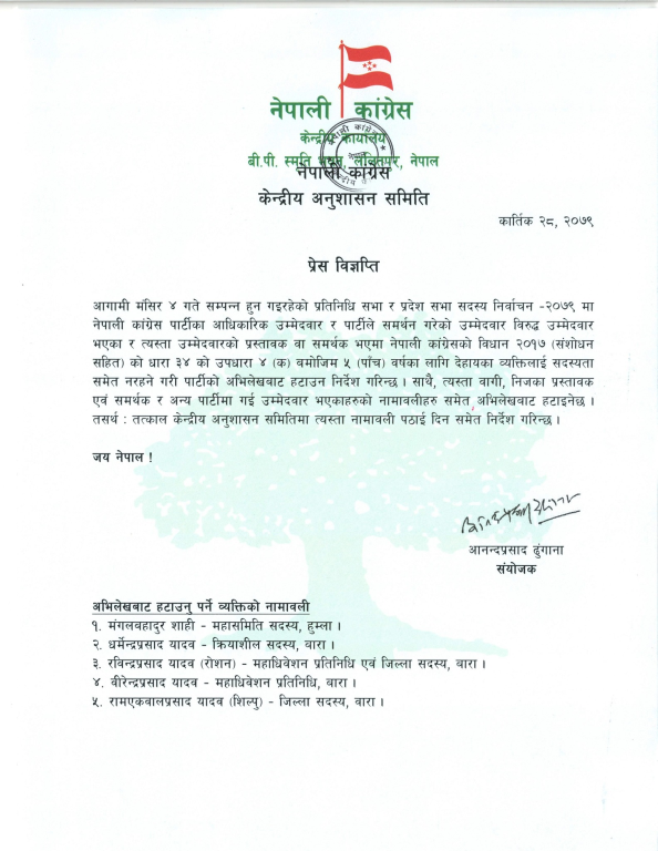 कांग्रेसविरुद्ध लागेको भन्दै ५ जनालाई पार्टीबाट निष्काशन