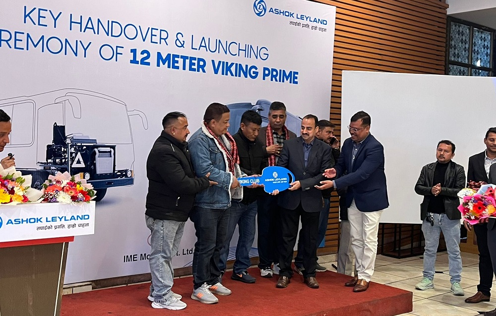 काठमाडौं । अशोक लेल्याण्डको नेपालका लागि आधिकारिक वितरक आईएमई मोटर्सले अशोक लेल्याण्डको भाइकिङ १२ एम प्राइम बस नेपाली बजारमा ल्याएको छ । कम्पनीका अनुसार ४४ सिटे बसका चार वटा युनिट वितरण गरिएको छ ।