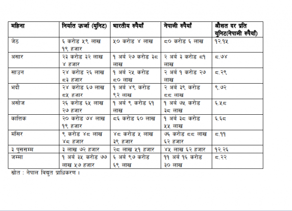 प्राधिकरणले गत आर्थिक वर्ष २०७८र७९ को जेठ तथा असारमा २९ करोड ९१ लाख युनिट विद्युत निर्यात गरी दुई अर्ब ८३ करोड ८८ लाख रुपैयाँ आम्दानी गरेको छ । चालू आव २०७९र८० को ३ पुससम्ममा एक अर्ब पाँच करोड ८६ लाख ३४ हजार युनिट विद्युत निर्यात गरी आठ अर्ब ३२ करोड ४२ लाख ४० हजार रुपैयाँ आर्जन गरिएको छ ।