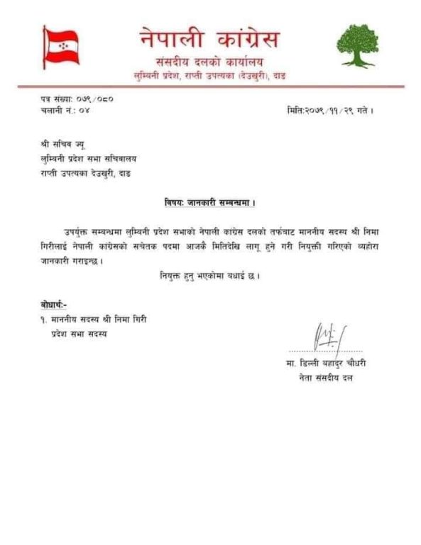 काठमाडौं । नेपाली कांग्रेस लुम्बिनी प्रदेश संसदीय दलको सचेतकमा निमा गिरी नियुक्त भएकी छन् ।
