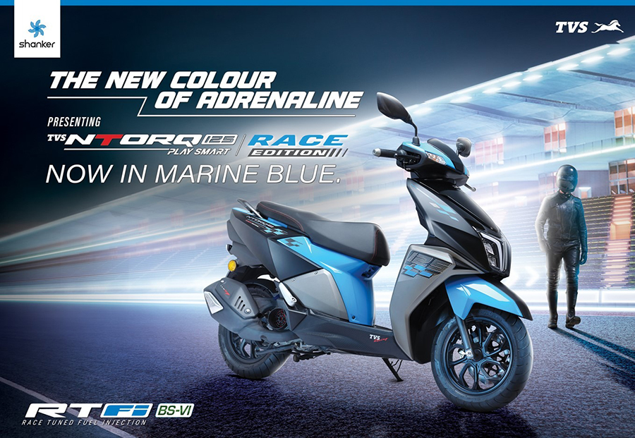 टीभीएस एनटर्क १२५ रेस एडिसनको नयाँ स्ट्राइकिङ मरिन ब्लु कलरमा समावेश चेकर्ड फ्ल्याग रेस–प्रेरित ग्राफिक्सले छुट्टै स्टाइल स्टेटमेन्ट बनाउने कम्पनीले बताएको छ ।