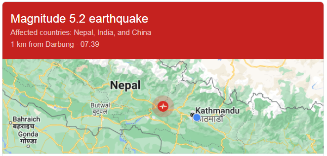 बिहान ७ बजेर ३९ मिनेट जाँदा भुकम्पको धक्का महसुस गरिएको हो । भुकम्प ५.२ म्याग्निच्युटकाे रहेकाे प्रारम्भिक अनुमान छ। विस्तृत विवरण भने आउन बाँकी छ।