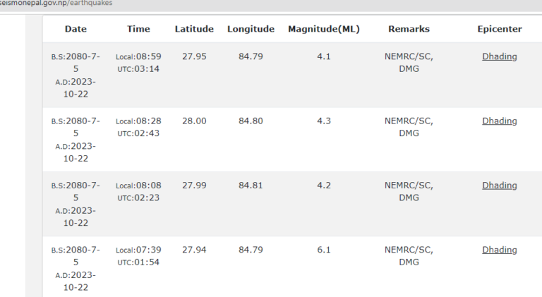 धादिङ केन्द्र भएर बिहानमा मात्र ४ पटक भुकम्प, ७ः३९ काे भुकम्प ६.१ म्याग्निच्युडकाे रहेकाे पुष्टी
