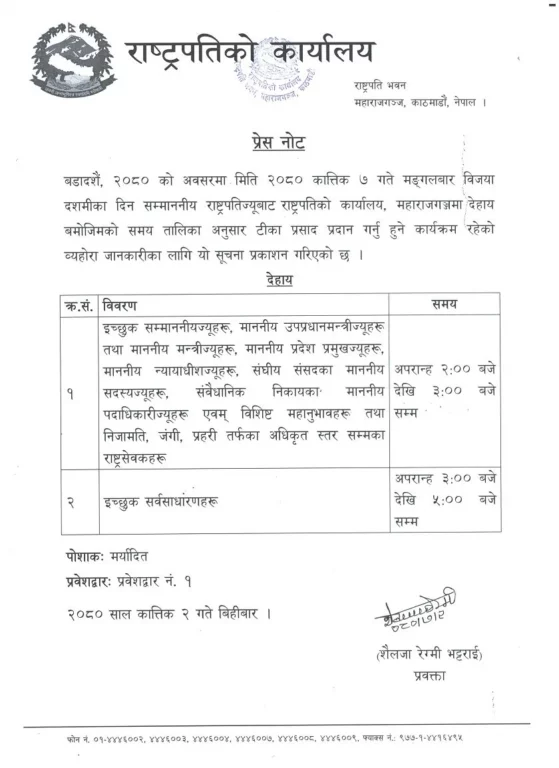 राष्ट्रपतिबाट टीका प्रसाद ग्रहण गर्न इच्छुक सम्माननीय, माननीय, उपप्रधानमन्त्री तथा मन्त्री, प्रदेश प्रमुख, न्यायाधीश, सांसद, संवैधानिक निकायका पदाधिकारी तथा निजामती, जङ्गी, प्रहरीतर्फका अधिकृतस्तरसम्मका राष्ट्र सेवकका लागि अपराह्न २ देखि ३ बजेसम्म समय तोकिएको छ ।