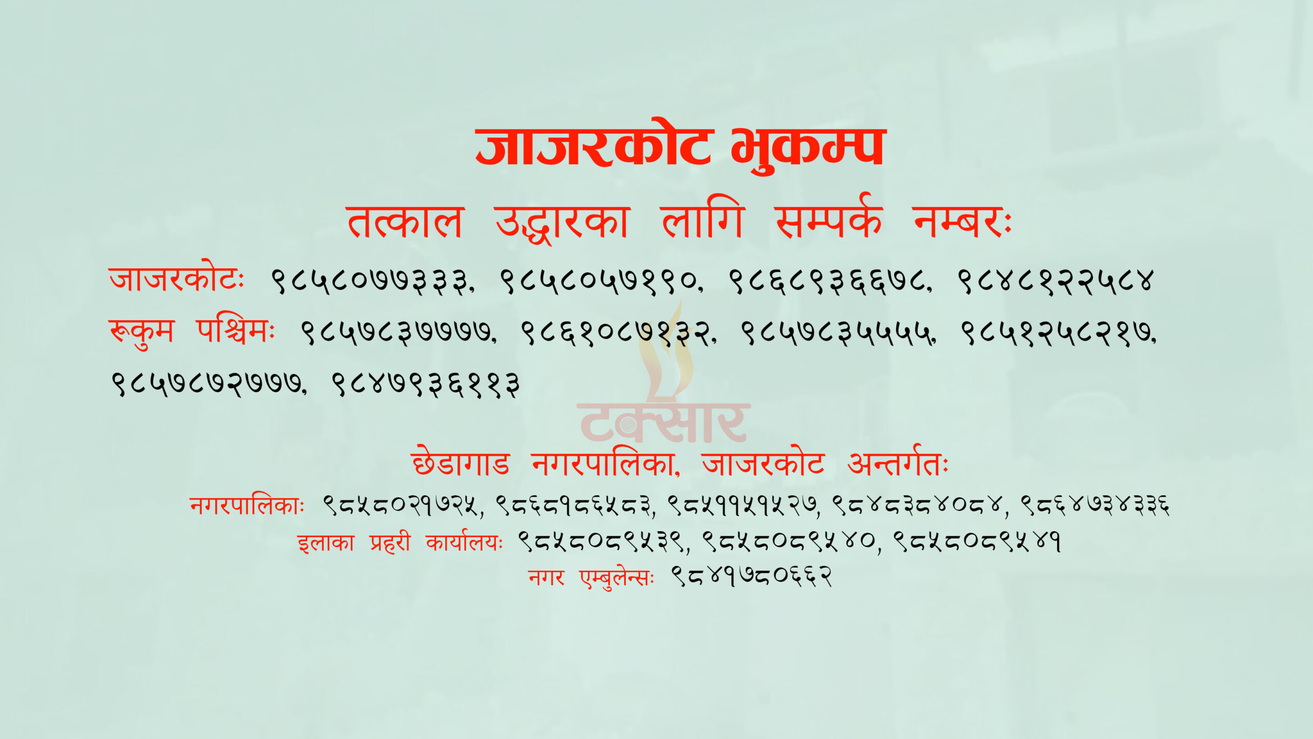 जाजरकोटः ९८५८०७७३३३, ९८५८०५७१९०, ९८६८९३६६७८, ९८४८१२२५८४