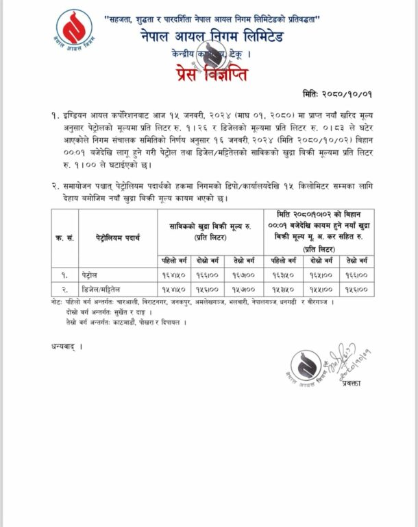 आज बसेको निगम सञ्चालक समितिको बैठकले पेट्रोल र डिजेलको मूल्य प्रतिलिटर एक–एक रुपैयाँ घटाएको हो ।नयाँ मूल्यअनुसार पेट्रोलको मूल्य पहिलो वर्गको उपभोक्ताका लागि १६३ रुपैयाँ ५० पैसा, दोस्रो वर्षको उपभोक्ताका लागि १६५ र तेस्रो वर्गको उपभोक्ताका लागि १६६ रुपैयाँ तोकिएको छ ।