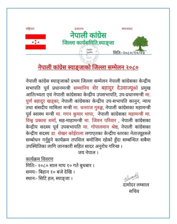 नेपाली कांग्रेस स्याङजाद्धारा माघ १० गते आयोजित जिल्ला सम्मेलनलाई सम्बोधन गर्न सभापति देउवा सहित उपसभापति एवम् नेपाल सरकारका उपप्रधानमन्त्री पुर्ण बहादुर खड्का, नेपाल सरकारका कानुन न्याय तथा संसदीय मामिला मन्त्री धनराज गुरुङ,महामन्त्रीहरू गगन कुमार थापा र बिश्वप्रकाश शर्मा, सह-महामन्त्री जीवन परियार, नेपाल सरकारका पुर्व उपप्रधानमन्त्री तथा पार्टीका पूर्व उपसभापति गोपालमान श्रेष्ठ, केन्द्रिय सदस्य डा.शेखर कोइराला लगायतको उपस्थिति रहने नेपाली कांग्रेस स्याङ्जाका सचिव दामोदर लम्सालले जानकारी दिए ।