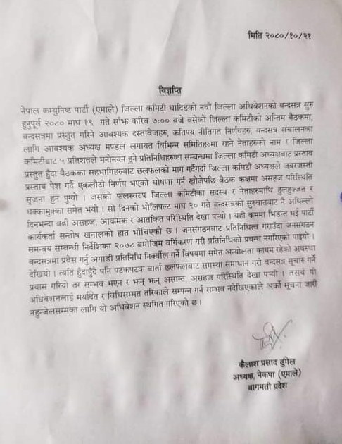 बागमती प्रदेश अध्यक्ष कैलाश ढुंगेलले आइतबार एक विज्ञप्ति जारी गर्दै विवाद र झडपसमेतको अवस्था आएको भन्दै अधिवेशन स्थगित भएको जानकारी दिएका छन् ।
