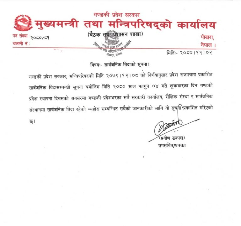 गण्डकी प्रदेशमा भाेलि सार्वजनिक बिदा