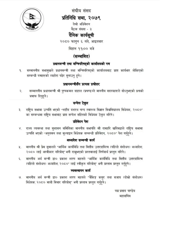 अर्थमन्त्री प्रकाशशरण महतले आर्थिक कार्यविधि तथा वित्तिय उत्तरदायित्व सम्बन्धी अध्यादेश स्वीकृत गरियोस् भन्ने प्रस्ताव पेश गर्ने कार्यसूची रहेको संसद् सचिवालयले प्रकाशित गरेको कार्यसूचीमा उल्लेख छ।