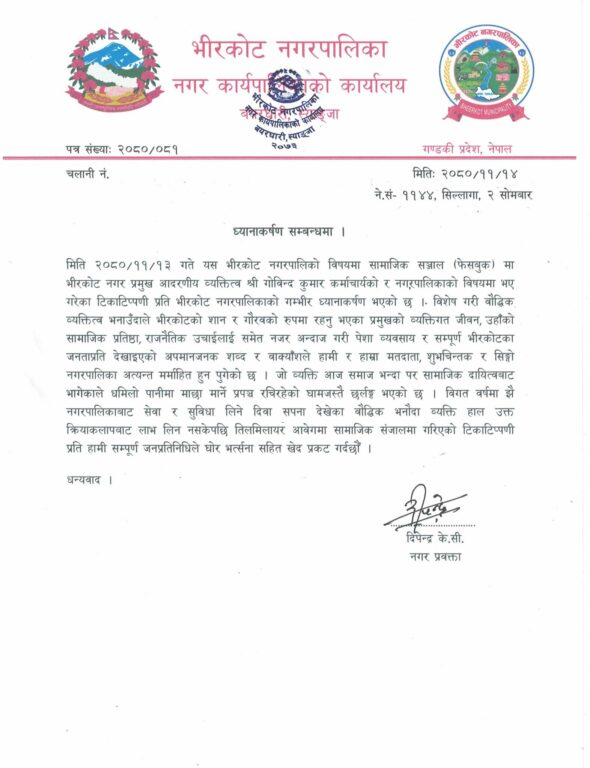 पालिकाले हिजाे (सोमबार) पालिका विरुद्ध भ्रामक टिकाटिप्पणी गरेको भन्दै नगरपालिकाका प्रवक्ता एंव वडा नम्बर १ का वडा अध्यक्ष केसीकाे हस्ताक्षरमा भीरकोट नगरपालिको विषयमा सामाजिक सञ्जाल (फेसबुक) मा नगर प्रमुख गोविन्द कुमार कर्माचार्यको र नगरपालिकाको विषयमा भए गरेका टिकाटिप्पणी प्रति भीरकोट नगरपालिकाको गम्भीर ध्यानाकर्षण गराइएको छ ।