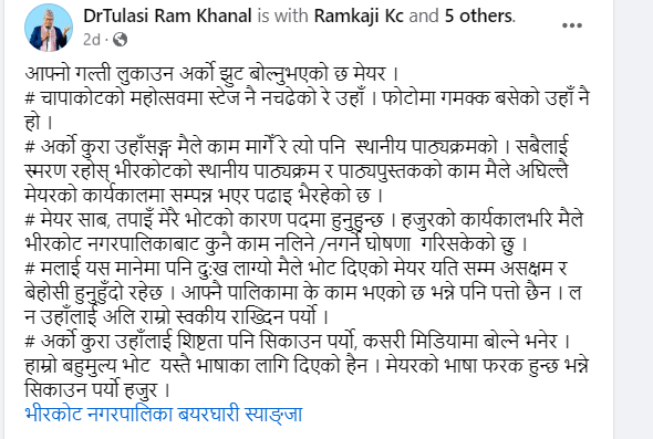 उक्त विषयलाई लिएर खनालले आफ्नो सामाजिक संञ्जालमा लेखेको विषयलाई लिएर नगरप्रमुख कर्माचार्यले अध्यक्ष खनाललाई पालिकासँग पुस्तक छाप्नको लागि पैसा मागेको र केही आर्थिक समस्याका कारणसहयोग गर्न नसक्ने भएपछि खनालले सामाजिक संञ्जालमा विभिन्न कुरा लेख्दै विरोध गरेको आरोप लगाएका छन् । उनले संचार माध्यममा दिएको अडियो अन्तर्वार्तामा समेत डा. खनाललाई अनादरवाची शब्दहरू प्रयोग गरिएको छ ।