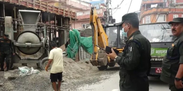 सडकमा थुपारिएको निर्माण सामाग्री हटाउँदै काठमाडौं महानगर