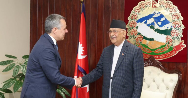 प्रधानमन्त्री ओली र स्विस विदेशमन्त्रीबीच शिष्टाचार भेट : विकास र सहकार्यका विषयमा छलफल