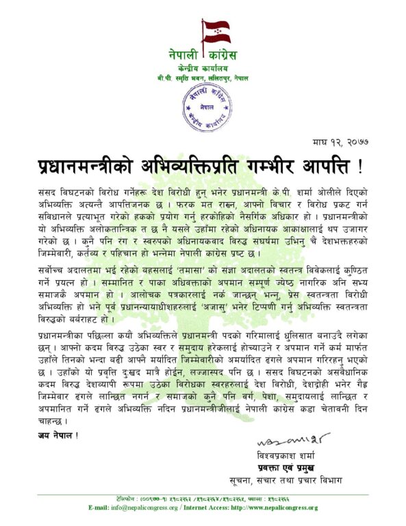 प्रधानमन्त्री केपी शर्मा ओलीको अभिव्यक्तिप्रति नेपाली कांग्रेसको आपत्ति