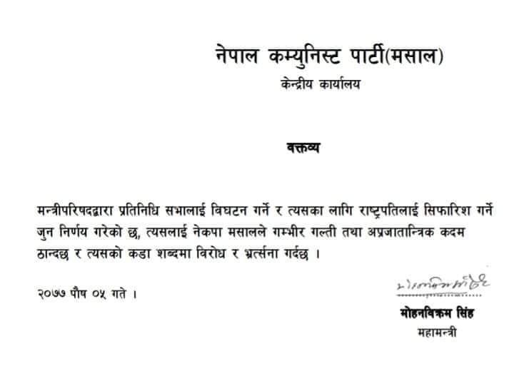नेकपा मसालले भन्यो, ‘संसद विघटन गम्भीर गल्ती तथा अप्रजातान्त्रिक कदम’