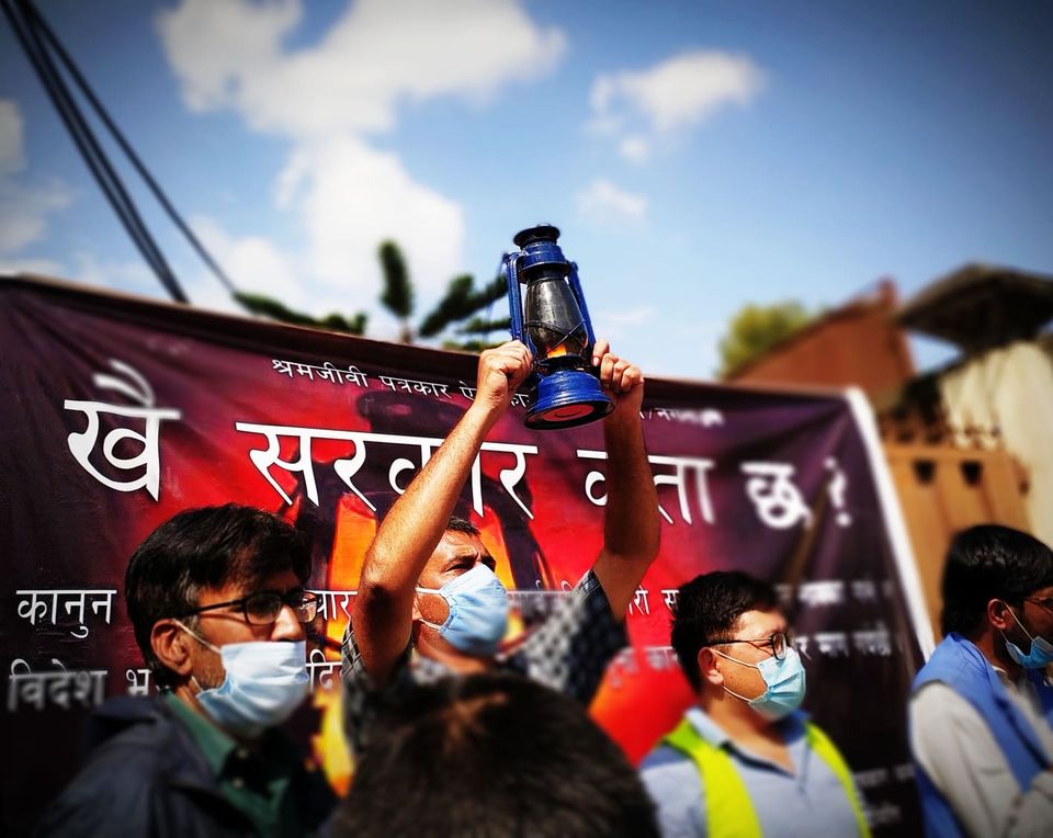 सूचना विभागमा लाल्टिन बालेर धर्ना दिँदै पीडित पत्रकार-कर्मचारीले सोधे, ‘खै सरकार कता छ ?’