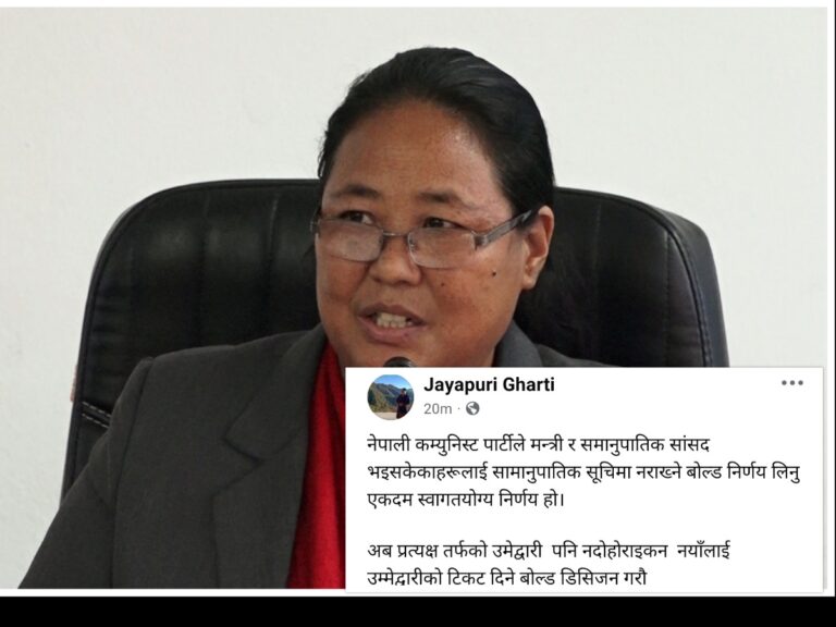 नेकपा नेतृ घर्तीले भनिन्,‘अब प्रत्यक्ष तर्फको उमेद्वारी पनि नदोहोराइकन नयाँलाई दिने ‘बोल्ड डिसिजन’ गरौँ’