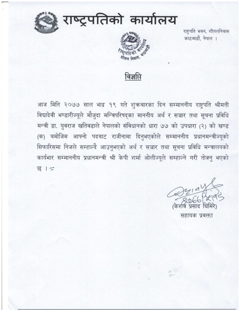 अर्थ र सूचना तथा प्रविधि मन्त्री खतिवडाको राजीनामा स्वीकृत, दुबै मन्त्रालय प्रधानमन्त्रीले सम्हाल्ने