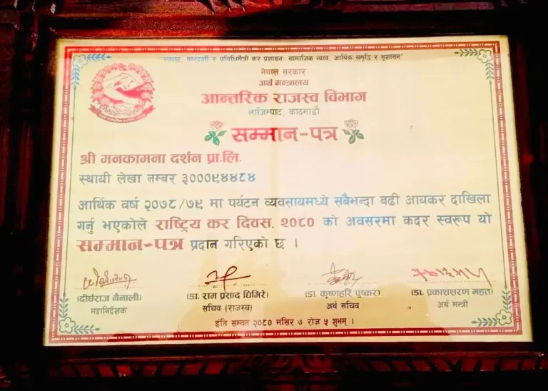 पर्यटन विधाको ठूलो करदाताको रूपमा मनकामना दर्शन प्रालि सम्मानित