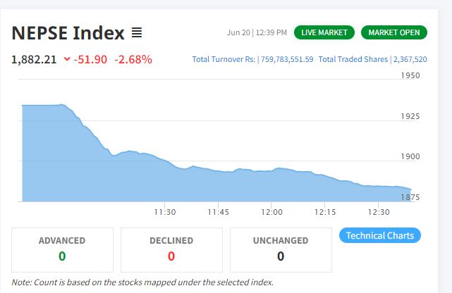 सेयर बजारमा पहिरो : कारोबार खुलेको डेढ घण्टामै ५१ अंकले घट्यो नेप्से