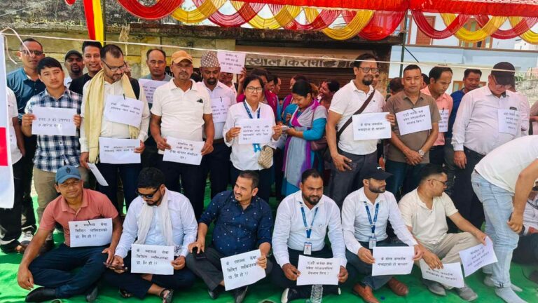स्थानीय सेवा ऐनको बिरुद्धमा लुम्बिनी प्रदेश सभा अगाडि स्वास्थ्यकर्मीको धर्ना सुरू
