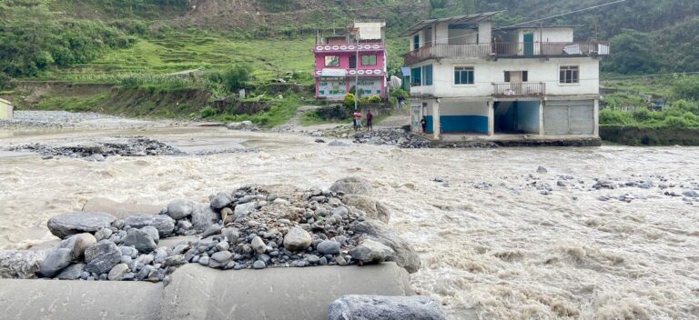 मेलम्चीमा आएको बाढीले अस्थायी पुल बगायो