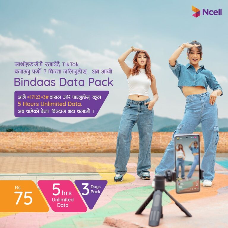 एनसेलको ‘बिन्दास डेटा प्याक’, ७५ रूपैयाँमा तीनदिन भित्र ५ घण्टा अनलिमिडेट डेटा